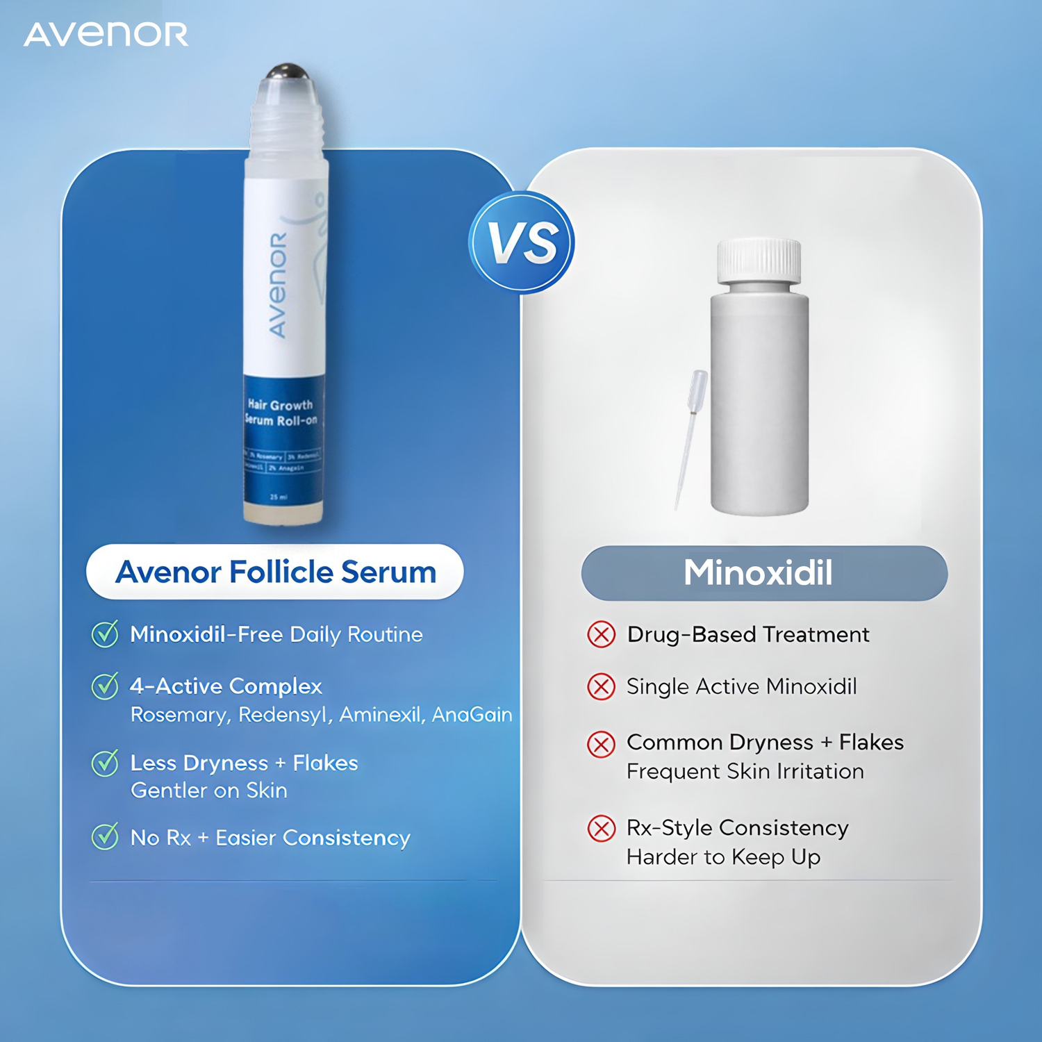 Unlike minoxidil, which relies on a single drug-based active, Avenor™ uses a multi-active, minoxidil-free formula designed for daily use to support fuller-looking hair and beard density, without the dryness and irritation many people experience.